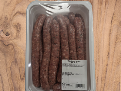 Composition & allergènesIngrédients : Viande de porc 88 % (France), eau, acidifiants : E326, E262, E331, Oignons 1,7%, Sel, Plantes aromatiques, Epices, Sirop de glucose, Arômes naturels, Arôme de fumée, Boyau naturel de porc.