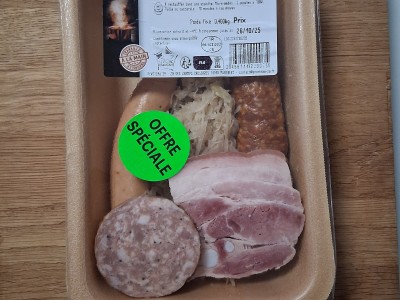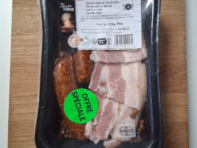 Ingrédients : Poitrine cuite 22.2 %, ( Poitrine de porc Origine France, Eau, Sel, Dextrose, Antioxydant : Erythorbate de sodium, Arômes naturels, Conservateur : Nitrite de sodium), Saucisses fumées cuites 19.4 % ( Viande de porc Origine France (90.8 %), Eau, Sel de Guérande, Arôme naturel de basilic, Epices, Dextrose, Poudre de Jus de Blette, Arômes naturels, Ferments. Boyau naturel de porc. Fumage au bois de hêtre), pommes de terre 20.8 % (Pommes de terre, eau), Poireau blanc 13.9 %, ( Poireau, Eau, Sel, Acidifiant : Acide citrique), Choux 13.9 %, ( Choux vert), Carottes rondelles 9.7 % ( Carottes, Eau, Sucre, Sel).